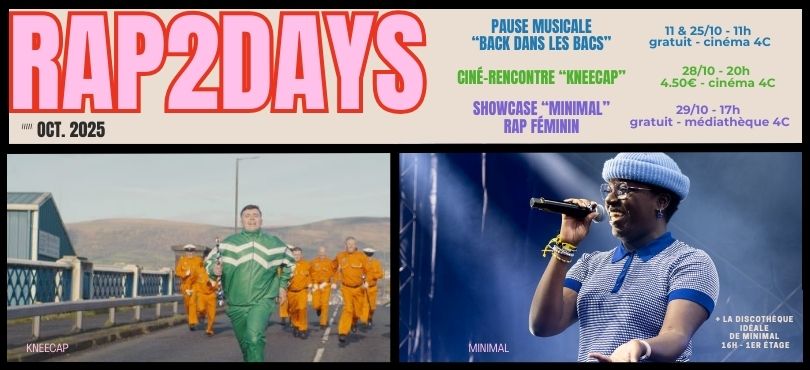 à 16 h - "La discothèque idéale de Minimal" : partez aux côtés de l'artiste Minimal et découvrez sa personnalité à travers les pépites et albums cultes des collections musicales des 4C. Chanson française, rap actuel ou soul et r'n'b, une sélection d'albums qui l'ont influencés et ont forgé son rapport à la musique.