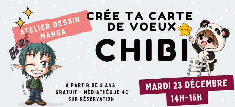 Cet atelier sera animé par la mangaka Caro-Lyn qui t'initiera aux techniques du dessin manga avec les chibis (petits personnages tout mignons proches des Pokémon). Tu pourras laisser parler tes envies, ton imagination et ta créativité pour concocter une carte de vœux originale et unique !