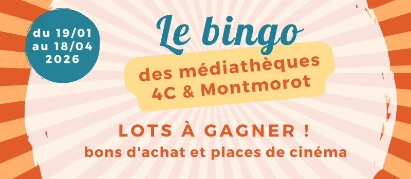 Du 19 janvier au 18/04/2026, participez au Bingo des 4C et de la médiathèque de Montmorot ! Vos bibliothécaires vous invitent à relever 12 défis (9 pour les moins de 12 ans) : empruntez autant de documents correspondant à chacun des défis pour participer au tirage au sort et gagner des bons d’achat ainsi que des places de ciné !