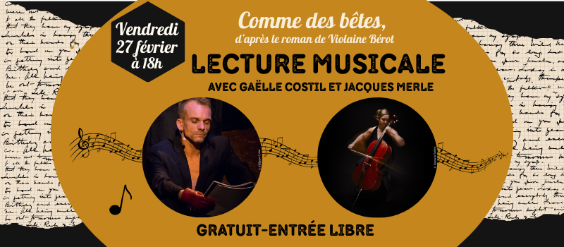 Vendredi 27 février, à 18h, venez profiter d'un temps de lecture musicale suspendu entre réalisme et poésie. Le comédien Jacques Merle et la violoncelliste Gaëlle Costil donne vie au percutant roman de Violaine Bérot Comme des bêtes.